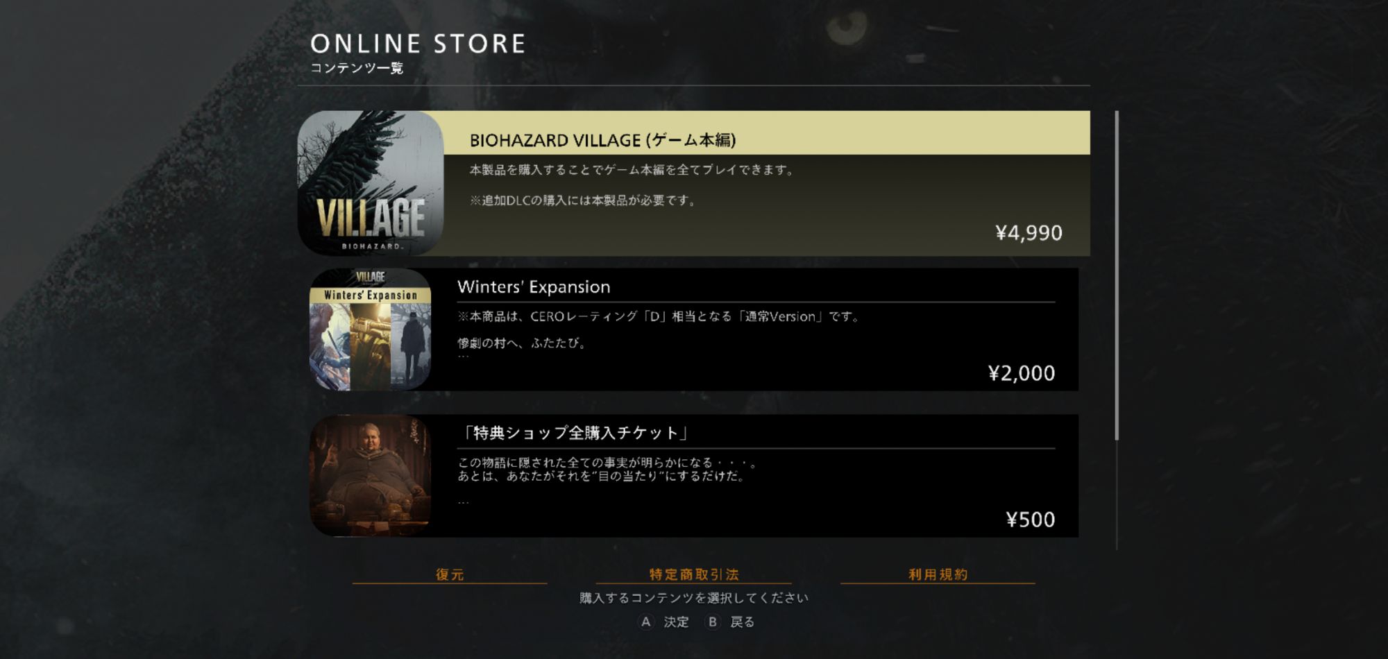 HOME > バイオハザード8 > バイオハザード8 バイオハザード8VILLAGE 2025年12月7日 スマホコントローラー推奨 ストーリー攻略武器食材の場所料理ミニゲームミニゲームヤギの置物EXTRA CONTENT SHOP トイレミニゲーム換金アイテム合成窓ガラスファイルアンジー人形の場所 バイオハザードVILLAGEの情報 会社CAPCOMジャンルサバイバルホラーリリース2023年10月30日価格4,990円公式サイトhttps://www.residentevil.com/village/jp/ -バイオハザード8