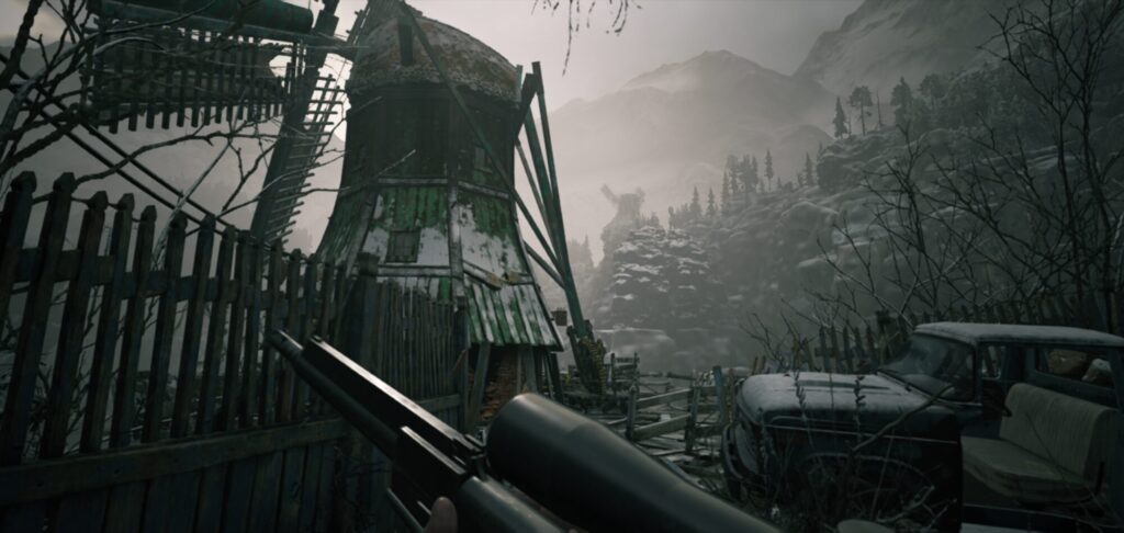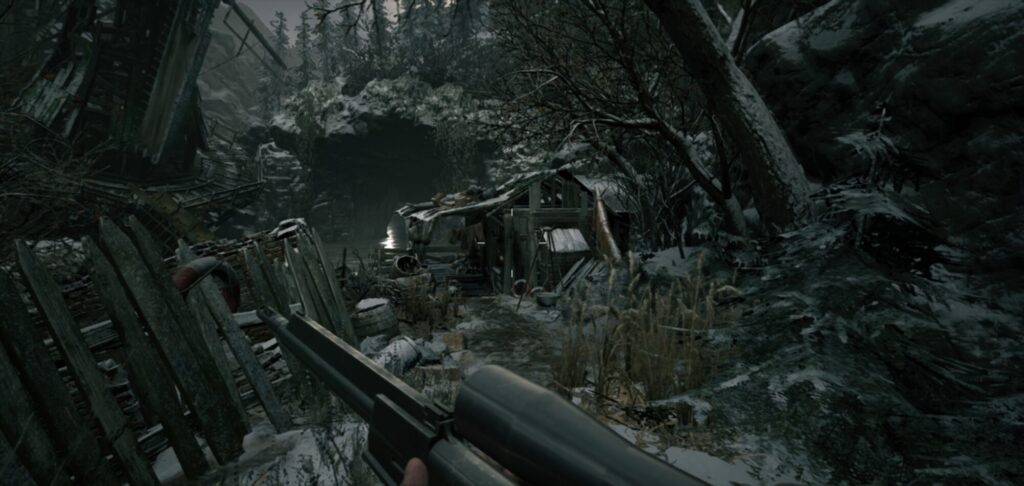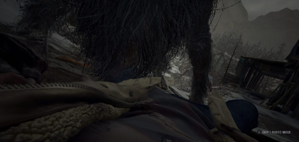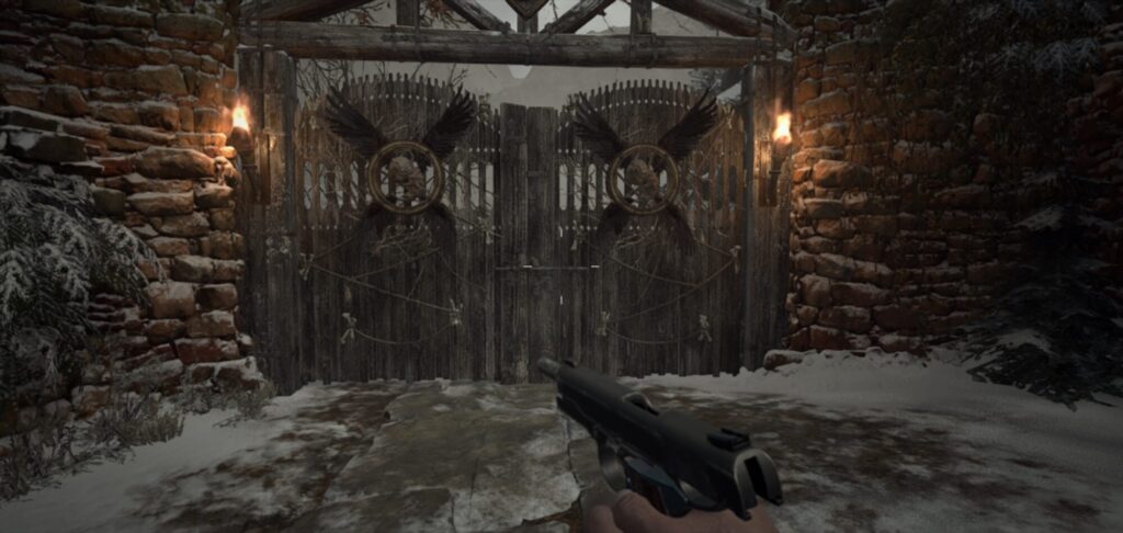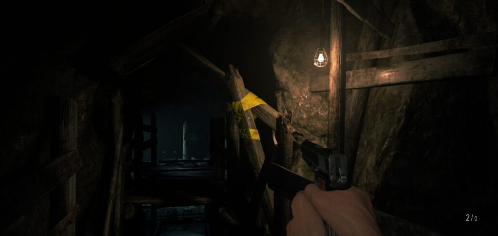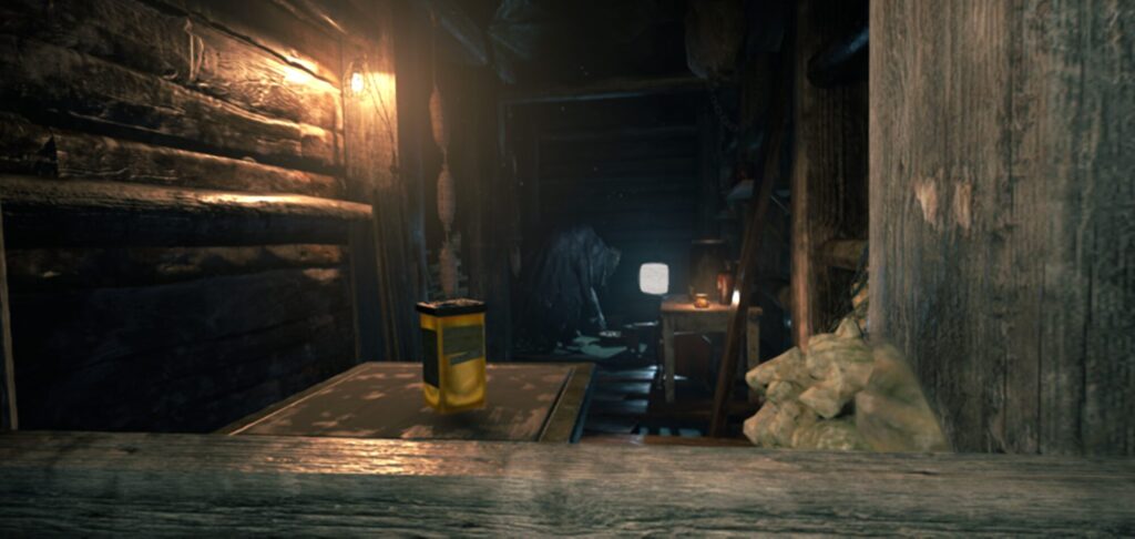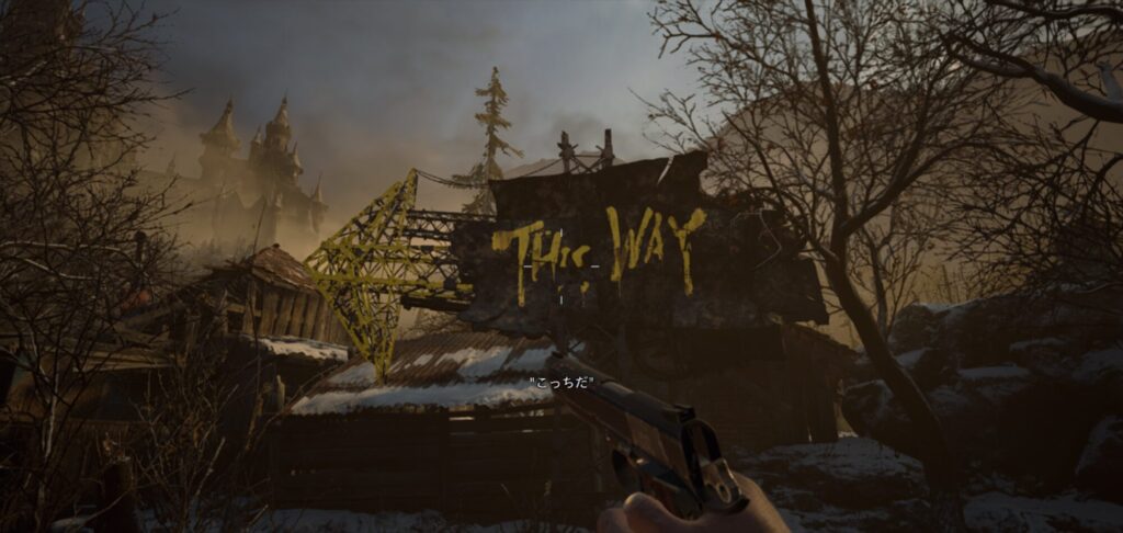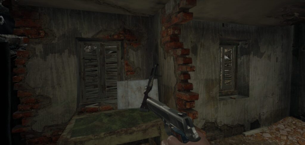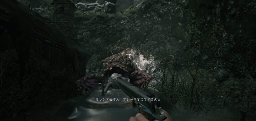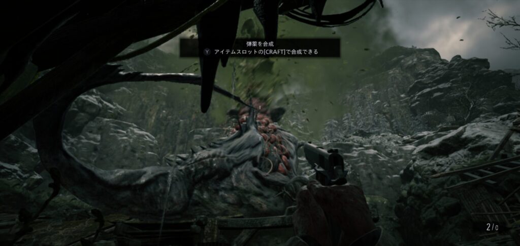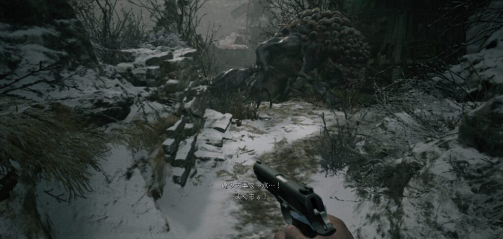 デカイ犬が襲ってくるので倒す(遠くから1発撃ち、家の奥へ避難することでダメージを受けずに倒せる)
