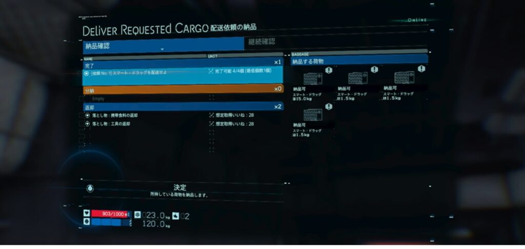 - 持てる重量をオーバーすると移動速度低下やバランスが崩れやすくなる