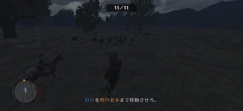 牛の群れの後方から馬で目的地まで誘導する