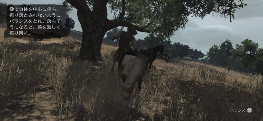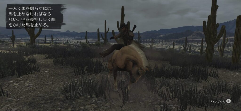 捕まえた馬に乗って落ちないようにスティックを左右に振ってバランスをとる