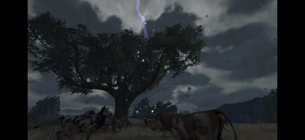 落雷によって牛が崖の方に逃げ出すため、回り込んで崖から落ちないように阻止する